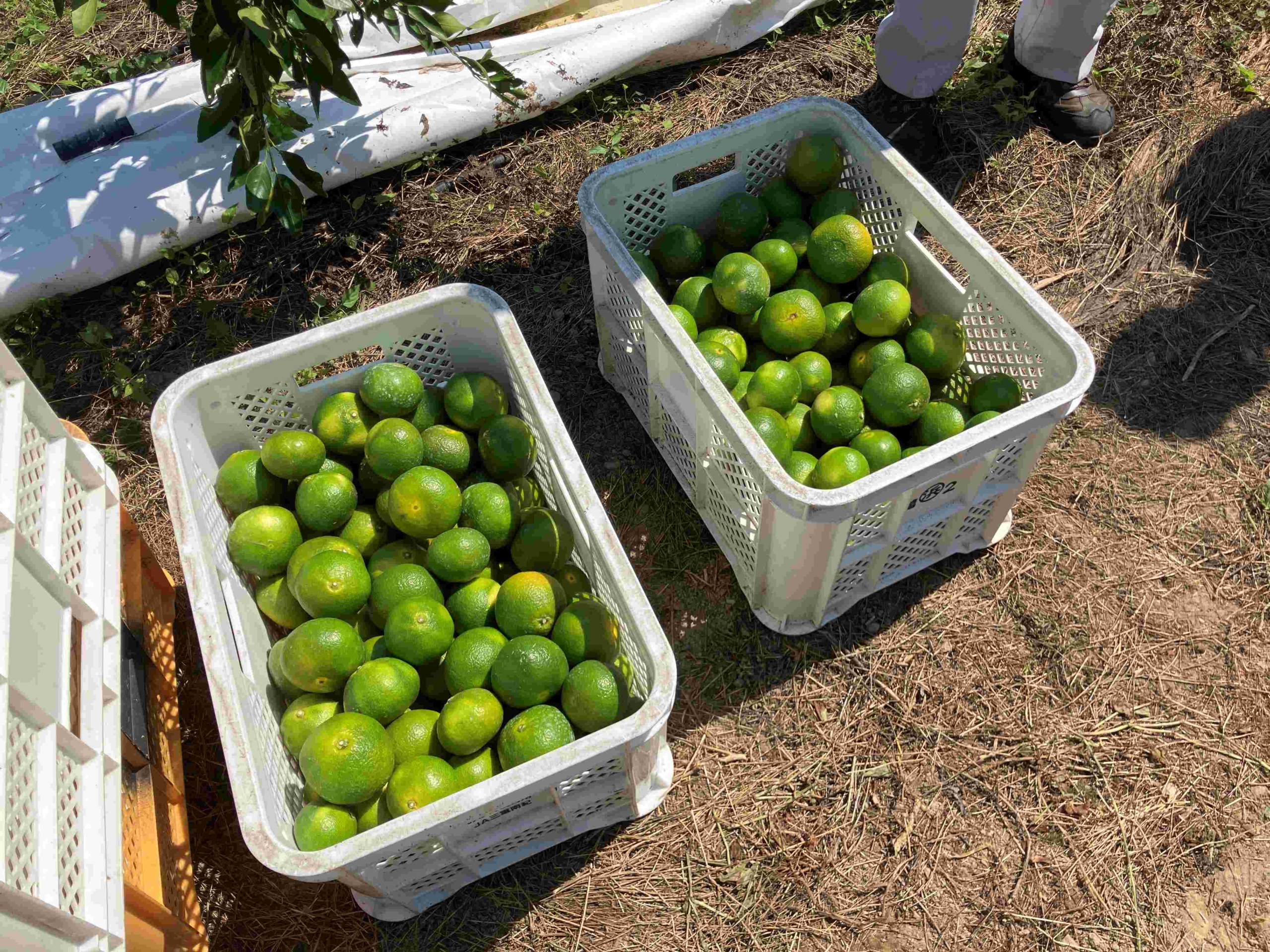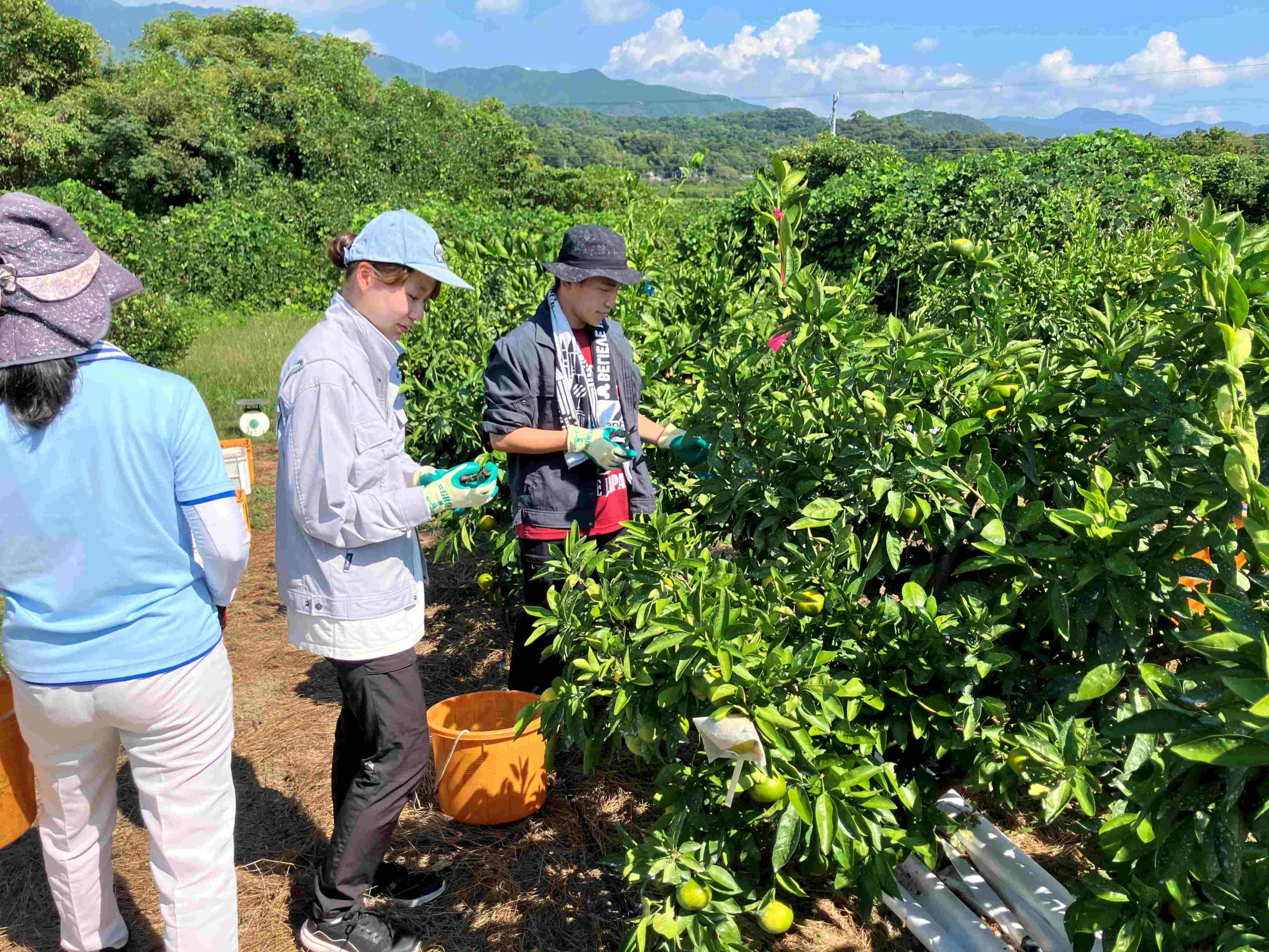 令和7年9月16日(火)に、坂井勝准教授、および学部4年生(岩田大志さん、飯田桃子さん)が、農研機構西日本農業研究センターの志村もと子研究員らとともに、御浜町志原地区で柑橘の収穫調査を行いました。今後、柑橘選果場での品質評価結果と、観測した土壌水分量の関係について解析を進めます。